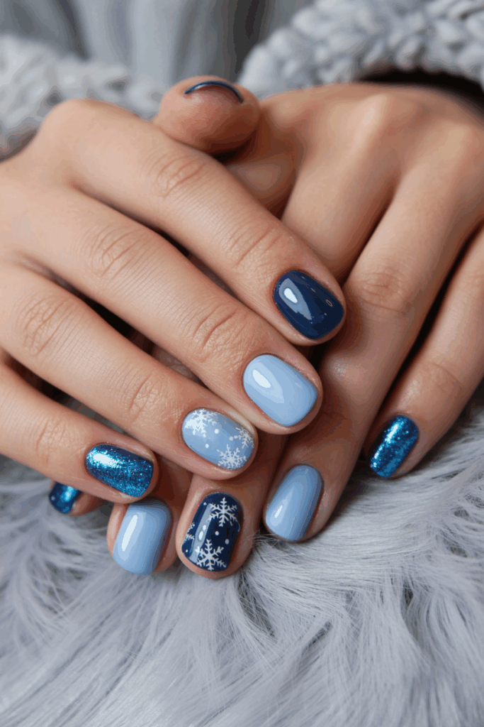 Navy blue nails are an effortless way to add depth and elegance to winter looks. The rich hue feels refined and versatile, pairing beautifully with silver jewelry and cool-toned outfits. A glossy finish enhances the color’s sophistication, while a bit of silver glitter on the tips can create a celestial “frosted night sky” effect. It’s an ideal choice for both everyday wear and evening events.