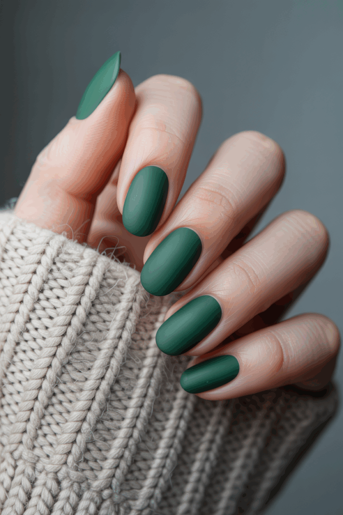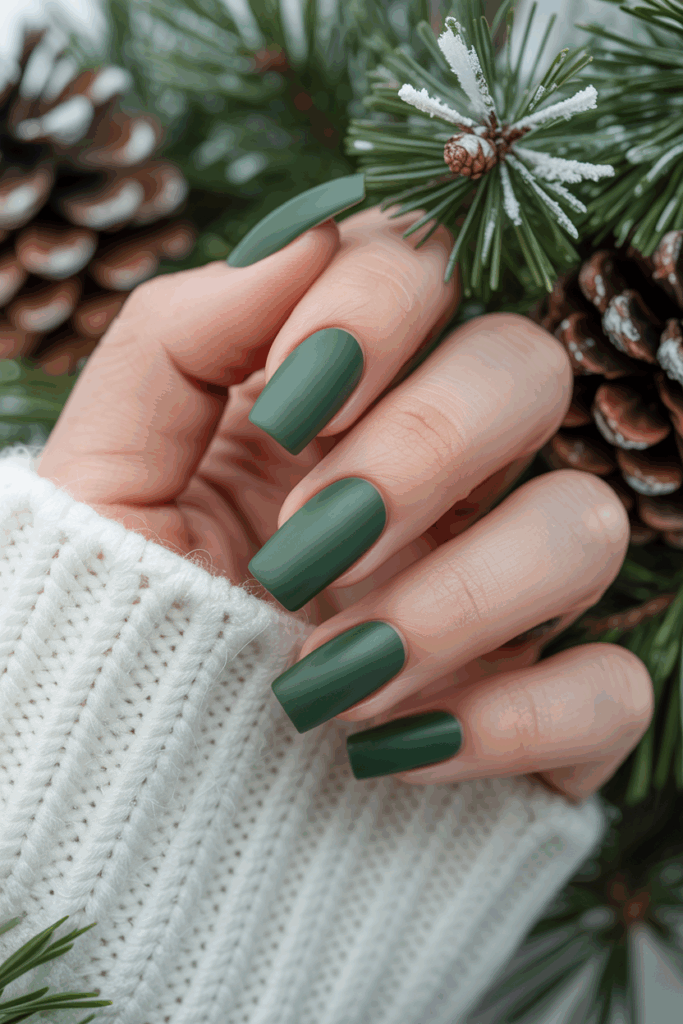 Forest green is a beautiful alternative to traditional reds during winter. Its earthy tone and soft finish bring a sense of natural calm while still feeling festive. When polished to a satin or matte sheen, it gives off a luxurious “velvet” texture that looks cozy and elevated. It’s the perfect shade for those who love subtle elegance and want something that pairs well with plaid scarves and dark neutrals.
