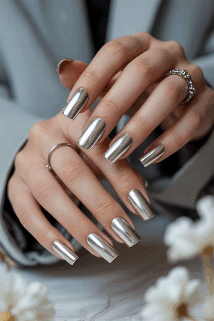 Chrome silver nails make a sleek, futuristic statement. The mirror-like shine feels bold and fashion-forward while remaining surprisingly wearable thanks to its neutral undertone. It looks stunning on short square nails or long almond shapes, catching every flicker of light. Perfect for nights out or New Year celebrations, this color adds instant edge and sophistication.