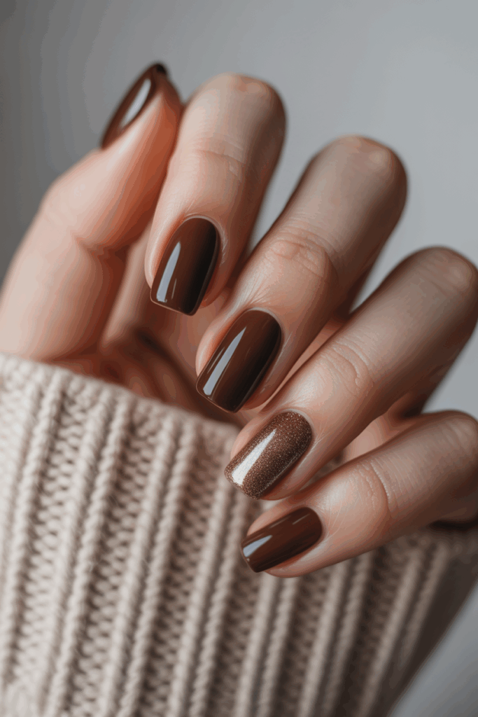 Chocolate brown nails offer the same comfort as a cup of cocoa on a cold day. The warm undertone gives off cozy sophistication, making it an ideal neutral for winter. Whether in glossy or matte finish, this rich shade feels grounded and versatile. It complements soft beige sweaters and gold accessories perfectly, adding warmth without overpowering your outfit.