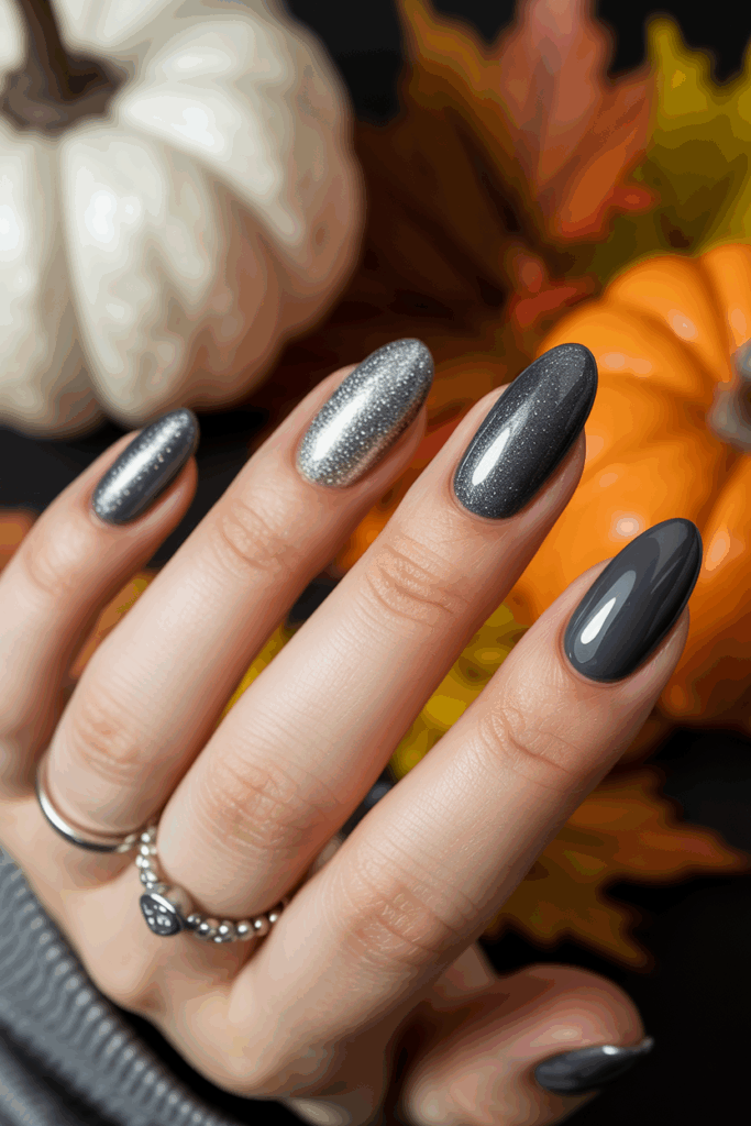 For an extra touch of artistry, paint a subtle ombré fade from matte grey at the base to silver shimmer at the tips. The result looks professional, polished, and perfect for late-fall gatherings.
