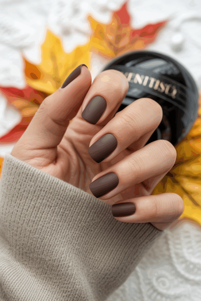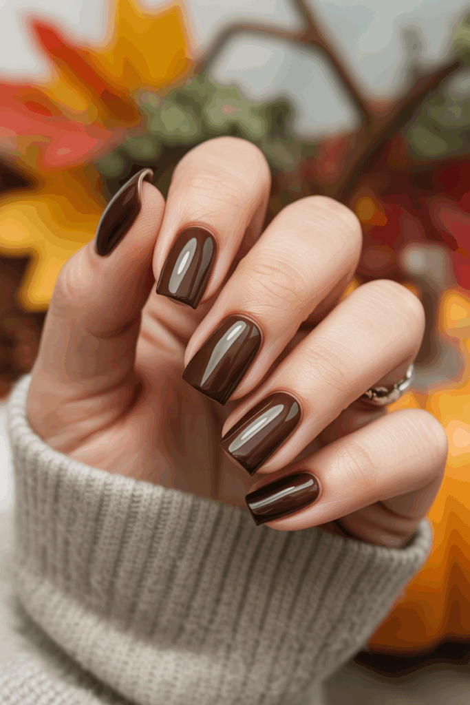 Chocolate nails are one of fall’s most comforting trends. The deep, creamy brown tone feels rich and indulgent — like a warm drink on a cold day. With a high-shine topcoat, it transforms into a chic neutral that complements gold rings, beige knits, or even black leather.