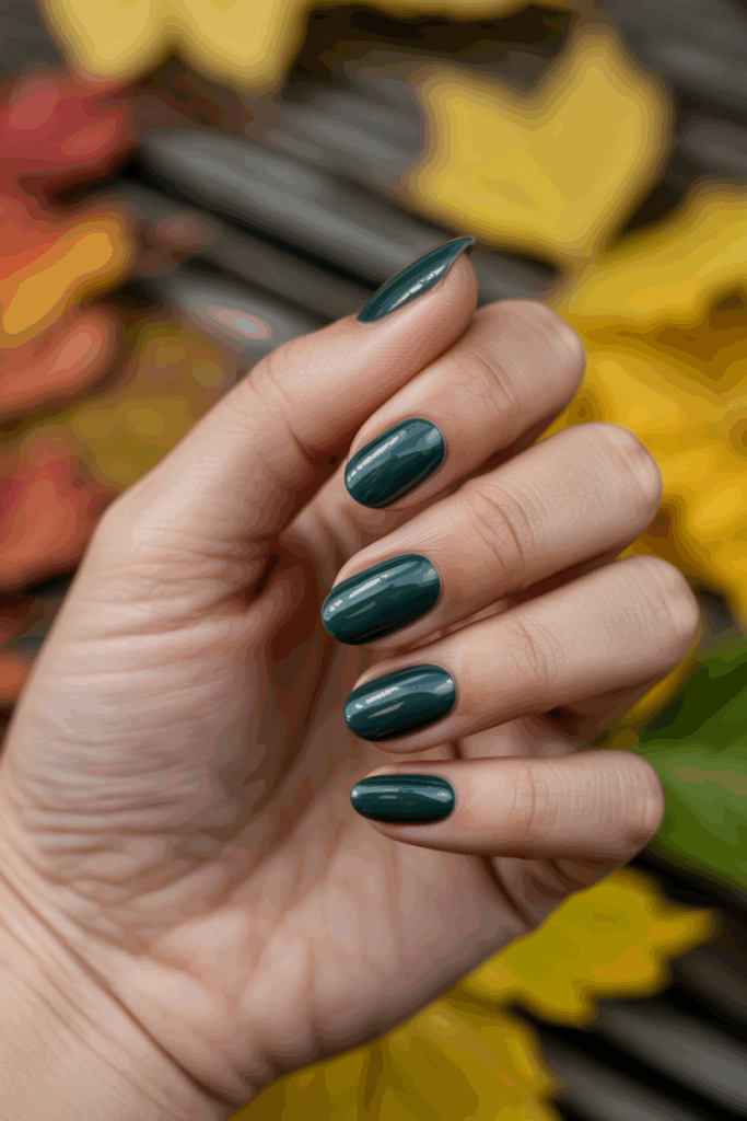 Forest green nails channel the quiet mystery of the woods in late autumn. The color is dark enough to feel moody but still full of natural depth. With a glossy finish, it reflects light softly, giving the impression of moss, pine, and evergreen leaves dusted with dew.