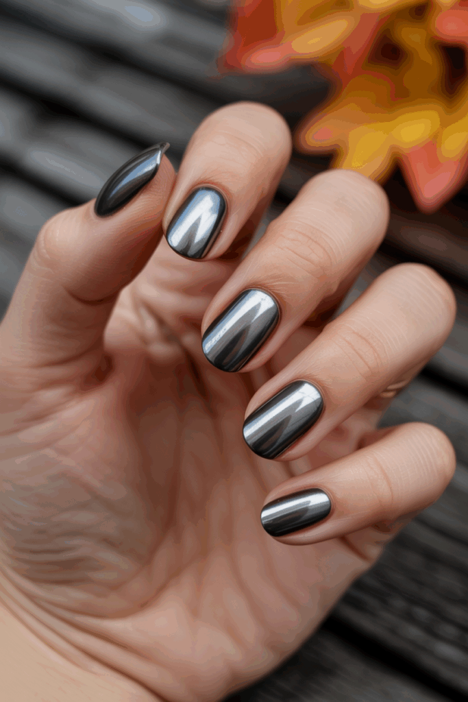 Gunmetal nails are for those who love a futuristic edge in their fall look. The deep grey metallic tone has an industrial-chic appeal, reflecting light with a cool, mirrored finish. It’s bold yet surprisingly versatile — pairing well with cozy neutrals, leathers, and edgy streetwear.