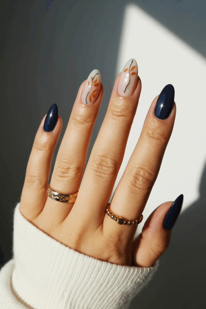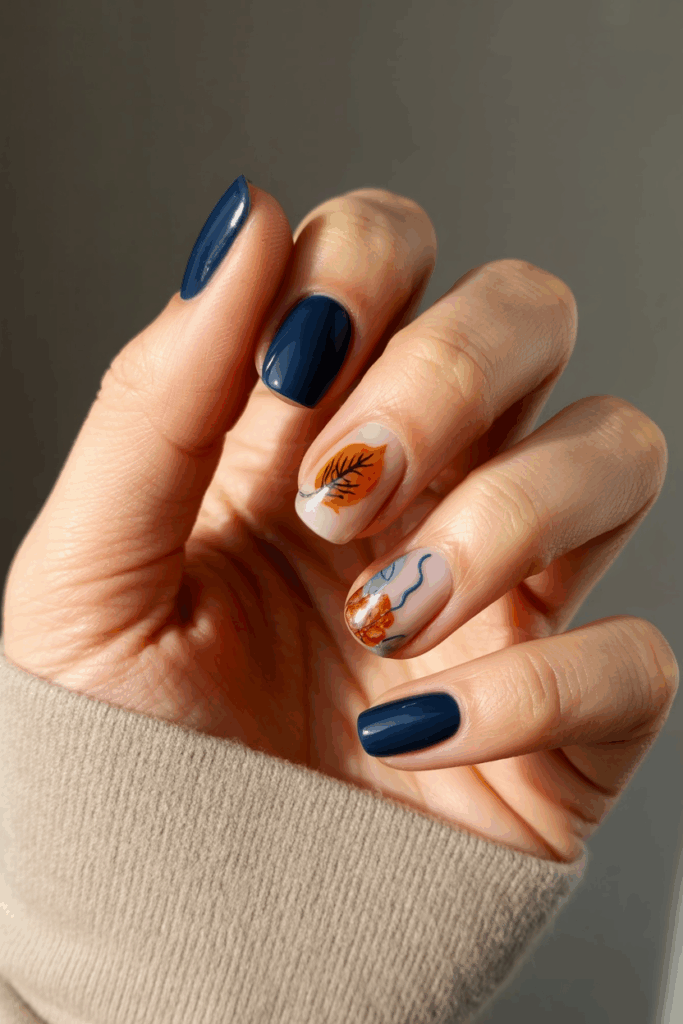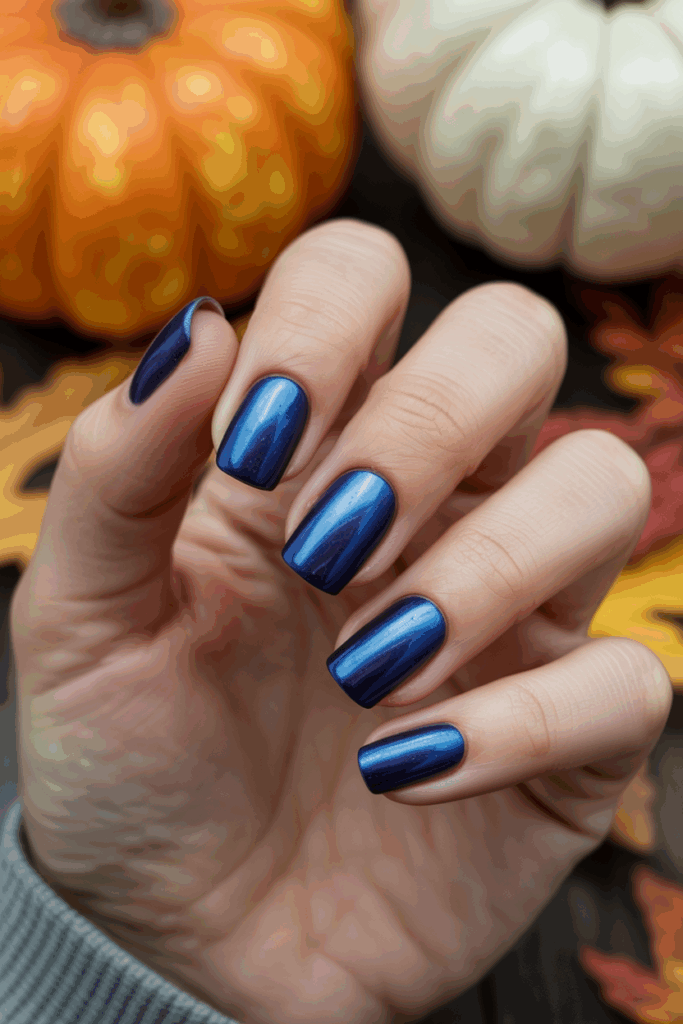 Dark navy nails bring quiet drama to fall style. When brushed with a metallic or pearlized sheen, they take on the depth of a starlit sky — bold yet elegant. This color is perfect for cooler undertones and adds a refreshing twist to traditional black manicures.