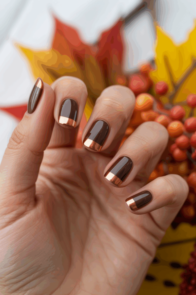 You can elevate this look by adding fine gold lines or soft bronze foil to one or two accent nails. The metallic contrast highlights the warmth of the brown and adds a touch of seasonal shimmer without losing the manicure’s minimalist edge.
