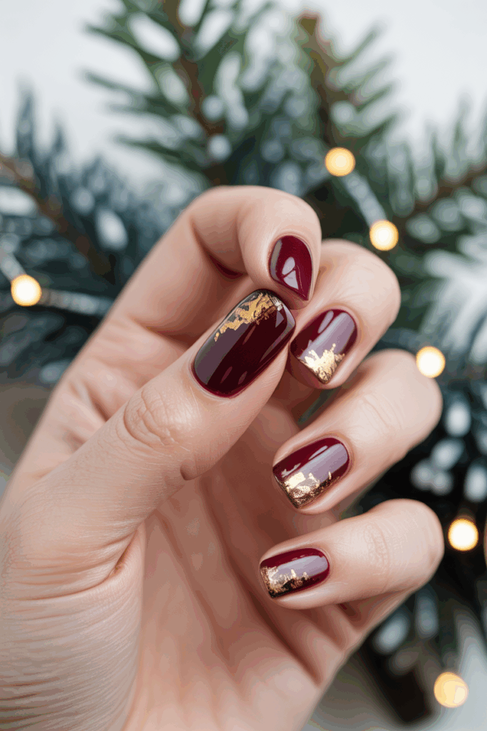 Paint a rich burgundy base and tap in irregular flakes of gold foil at the cuticle or along one edge for texture and warmth. The organic foil shapes look intentional but not fussy, and a sealing topcoat smooths everything to a glossy finish. It’s a five-minute upgrade that reads luxe for the holidays.