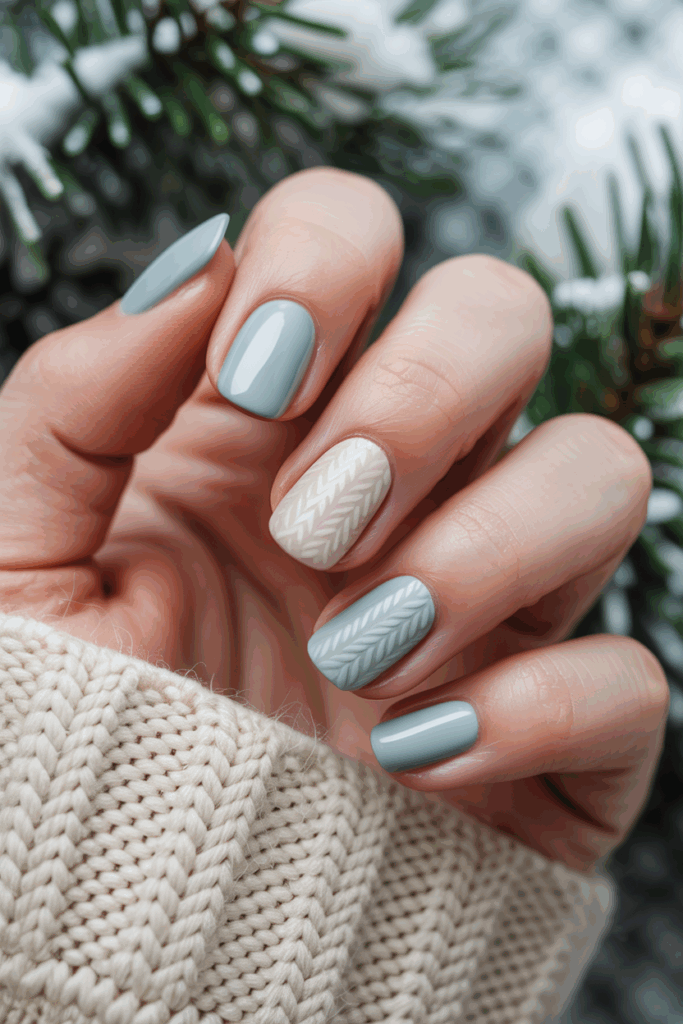 Keep most nails simple (cream, taupe, or gray) and add one or two cable-knit accents using a 3D gel or textured topcoat to mimic sweater stitches. The contrast of smooth nails with a single tactile detail feels chic and cozy without complicating your routine. It’s a quick way to add interest while staying firmly in the “easy nail art” category.