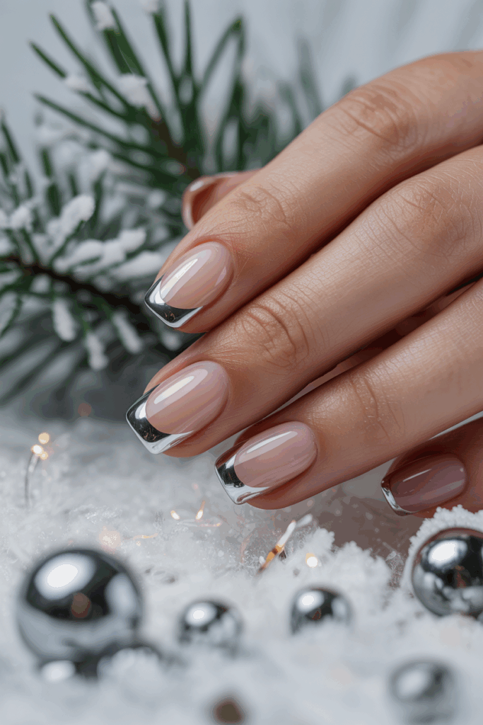 Reflective silver chrome tips over a sheer nude base deliver a sleek, minimal statement with almost no effort. Because the chrome sits only at the edge, it’s less maintenance than a full chrome manicure—and the contrast elongates the nail. It’s a party-ready twist on a classic that still feels wearable Monday through Friday.