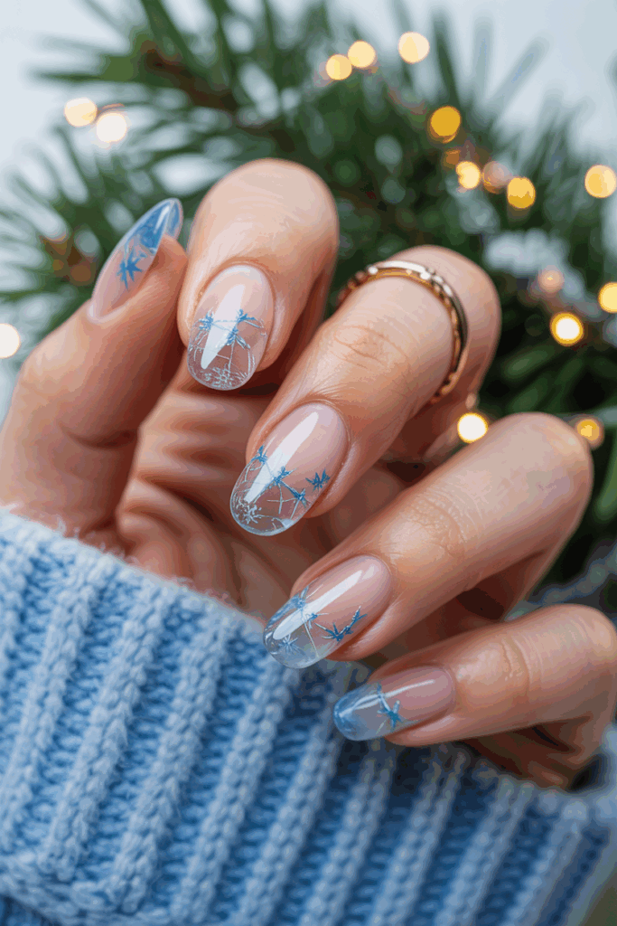 Blend pale blue into a deeper winter blue, then dust fine silver glitter where the colors meet for a seamless, sparkling transition. The gradient elongates the nail visually and looks great on almond or squoval shapes. It’s a simple sponge technique with high payoff in photos and under twinkle lights.