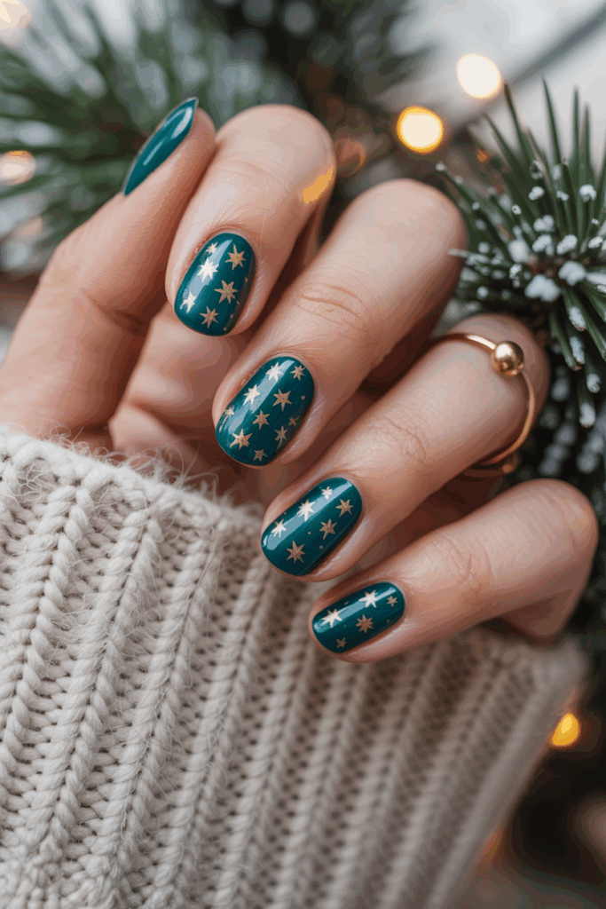 Deep evergreen paired with a few micro gold stars creates a chic, subtle holiday moment. Concentrate the stars along one edge or cluster them on a single accent nail to keep the design minimal. It’s festive without skewing novelty—and takes almost no time to apply.