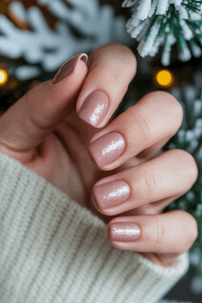 Dusty rose is a flattering, all-season neutral, and a frosted glitter topcoat shifts it instantly to winter. Choose fine, cool-toned glitter for a sugar-coated sheen that reads sophisticated instead of sparkly. The combo wears well with both gold and silver accessories, making styling easy.