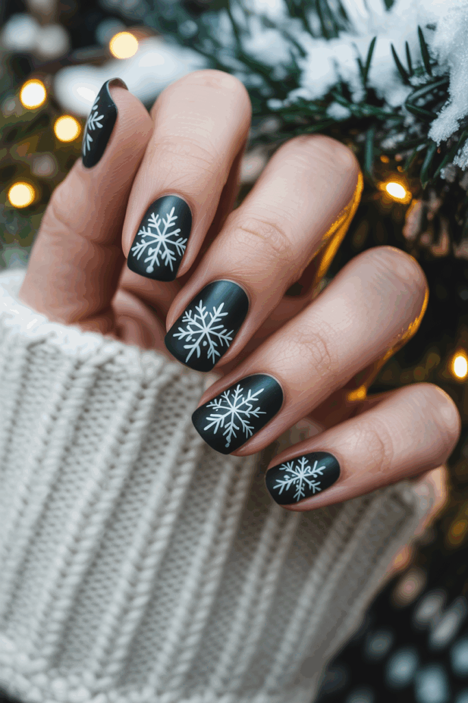 The high contrast of matte black with crisp white snowflakes feels striking but surprisingly simple to execute. Keep the art minimal—one larger flake per hand or a few tiny ones near the edge—to balance bold and wearable. A matte topcoat modernizes the whole look and helps disguise minor surface scuffs.