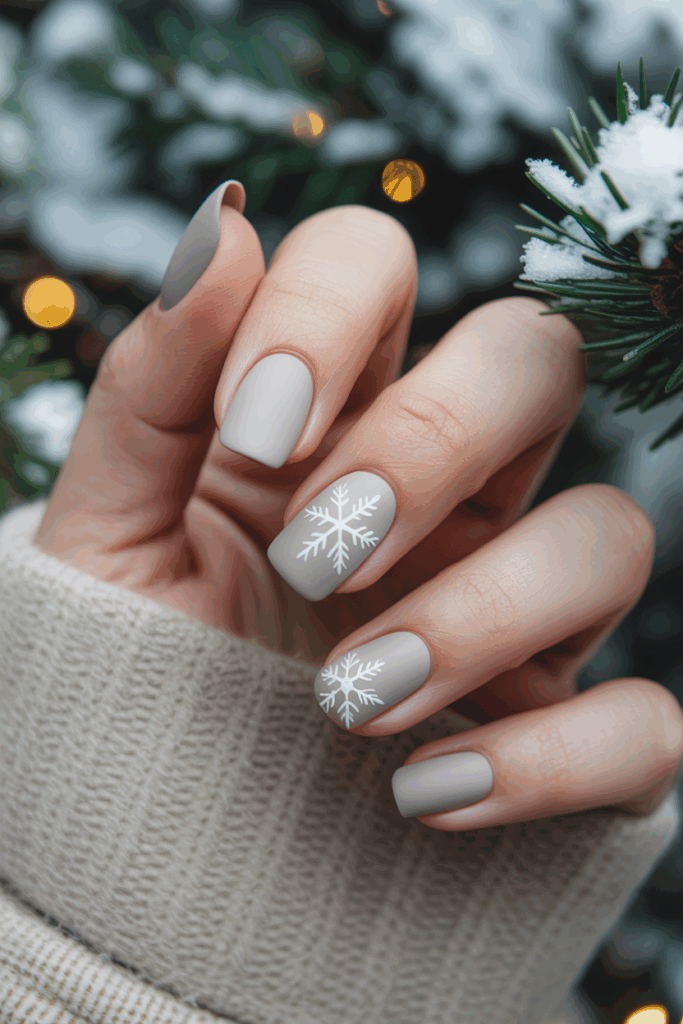 A soft, cool-toned gray is the perfect canvas for one or two crisp white snowflakes placed near the tip or off-center for movement. The palette is calm and sophisticated, and you can scale the detail up or down depending on your week. Add a satin topcoat to keep the finish modern and keep chipping at bay through glove season.