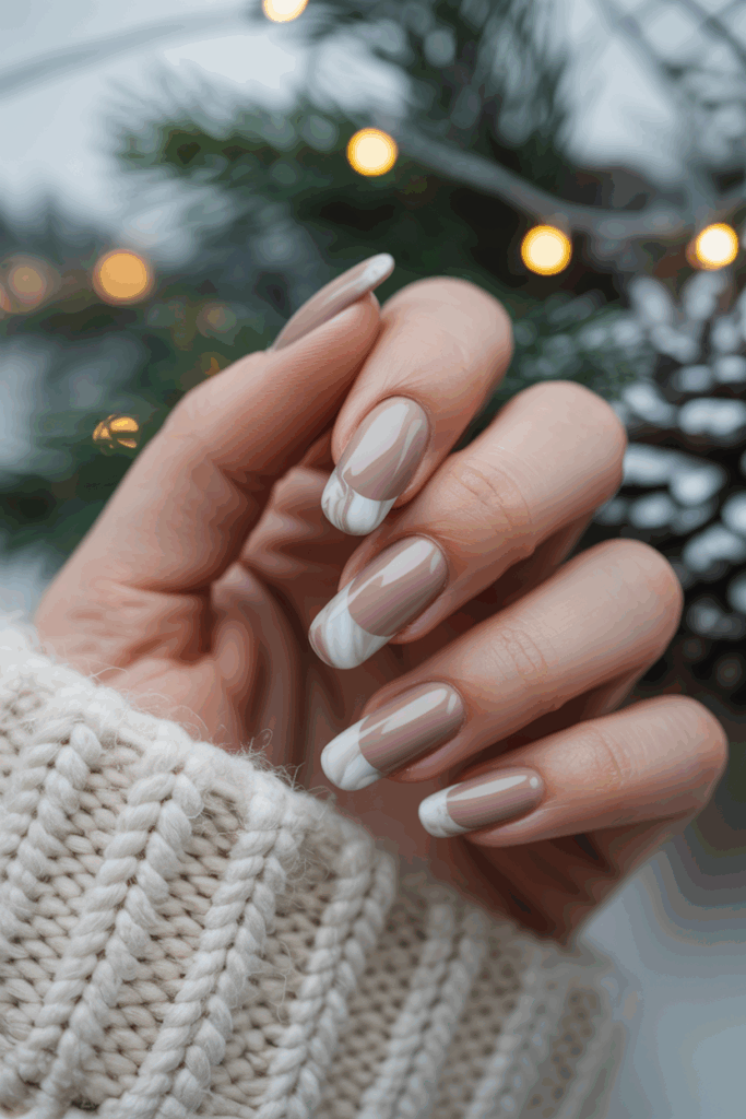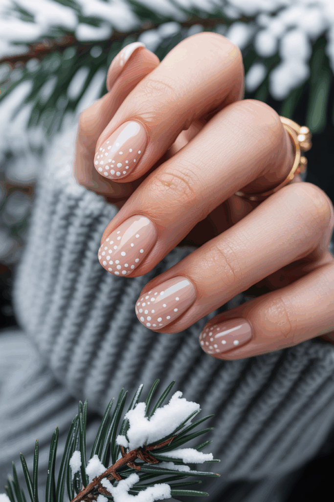 A sheer nude base dotted with tiny white “snow” gives a playful, minimalist effect that suits every nail length. Vary dot size slightly for a natural flurry, keeping spacing airy so it stays refined. The look is quick with a dotting tool (or toothpick) and works with any outfit in your winter lineup.