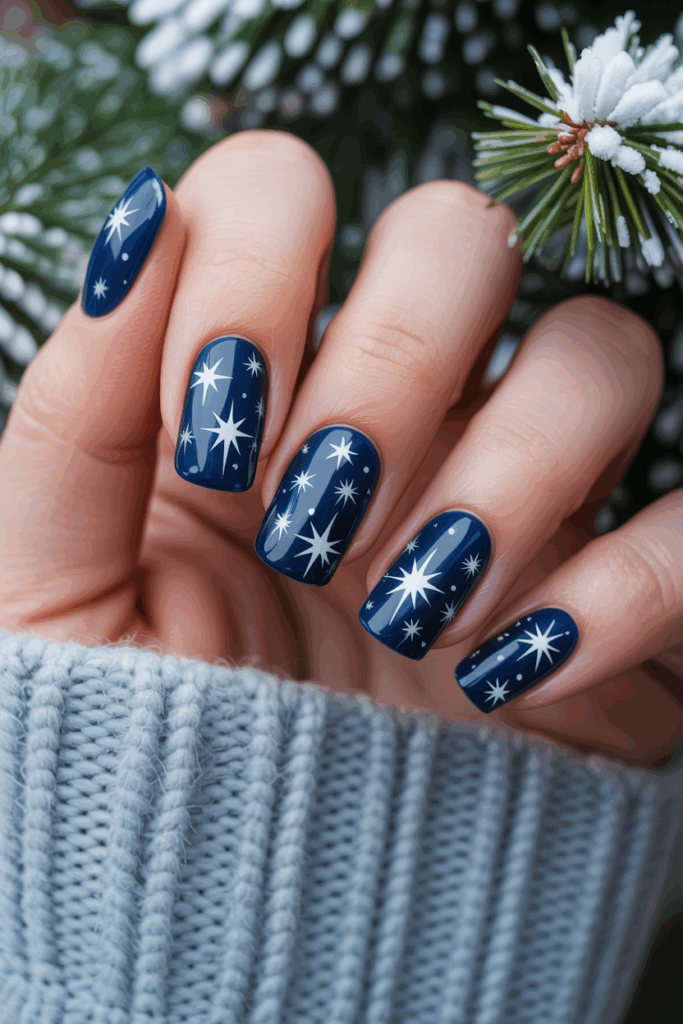 Choose a glossy navy and place a few tiny silver or white star decals near the tips or scattered like constellations. The dark base adds drama while the stars keep it whimsical and seasonally on-theme. Seal with a gel-like topcoat to prevent lifting—effortless, celestial, and perfect for evenings out.