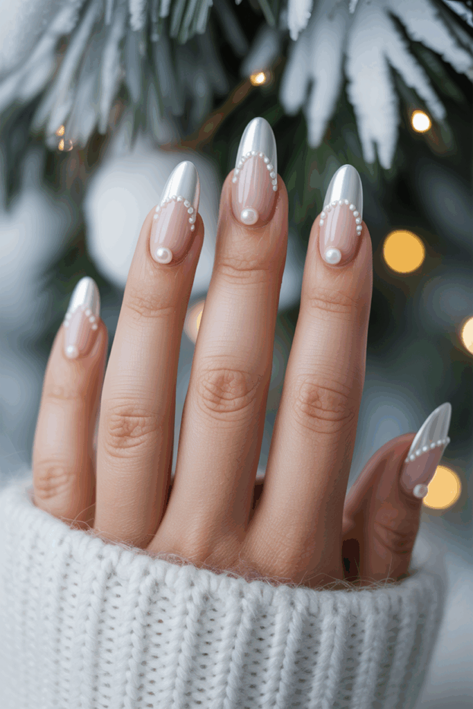 A milky white base topped with tiny half-pearls at the cuticle or clustered on one accent nail brings soft, bridal-meets-winter elegance. The embellishments elevate a basic manicure in minutes; keep them small for a delicate effect. Finish with a smoothing topcoat to lock everything in place.