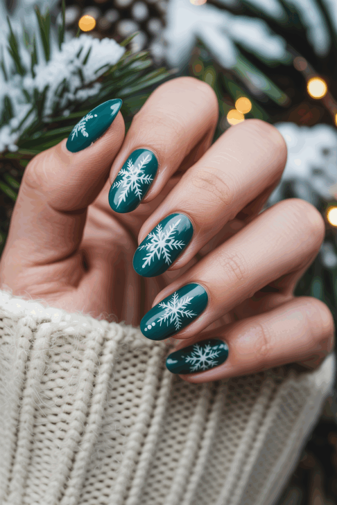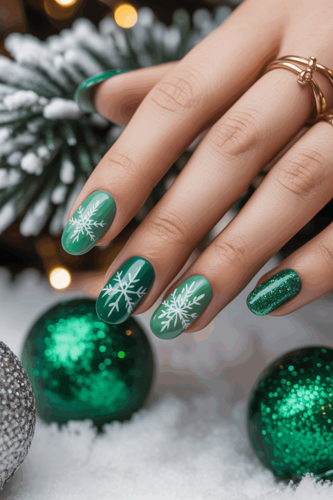Start with a saturated forest base and layer delicate white snowflakes using a thin brush or stamping plate for crisp lines. Vary the size and placement—one larger flake on a feature nail and smaller hints on others—to create movement while maintaining cohesion. A touch of fine silver glitter at the flake centers adds dimension that catches light beautifully. The contrast of deep green and bright white feels quintessentially winter and works equally well on short or long nails.