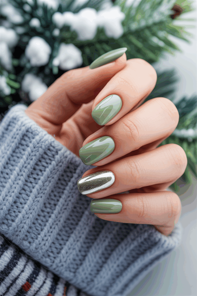 Combine a smooth, glossy sage base with slim silver chrome accents for a sleek, modern manicure that still feels soft. Outline the tips with a mirror-like edge, trace a fine chrome line down one side, or add a tiny chrome half-moon at the cuticle for subtle shine. The interplay of muted green and high-reflective silver is elegant under evening lights but stays understated for daytime wear. It is a simple, sophisticated way to finish the season with a little futuristic sparkle.