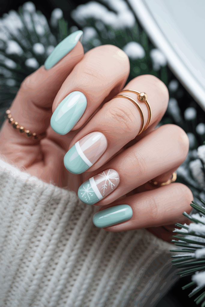 If you prefer clean lines and quiet details, paint nails in soft mint and add a single, slim embellishment per finger—a tiny dot at the center, a micro-star near the tip, or a whisper-thin gold stripe. The restraint keeps things modern and fresh while the color maintains a wintry coolness. Shorter lengths amplify the minimalist aesthetic, and a glassy topcoat completes the refined finish. It is the kind of manicure that looks intentional with zero fuss.