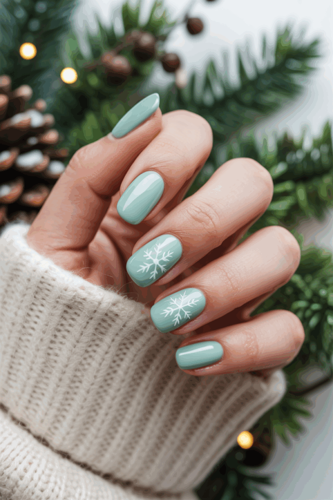 A cool mint base instantly feels fresh and airy, and a few delicate white snowflakes add festive detail without overwhelming the soft color. Place tiny snowflakes on two accent nails or cluster them near the tips to keep the design balanced and wearable. If you prefer shimmer, dust a fine silver glitter over the snowflakes so they sparkle gently in bright light. The end result is light, cheerful, and photogenic—great for daytime events, cookie swaps, and weekends wrapped in your favorite winter knits.