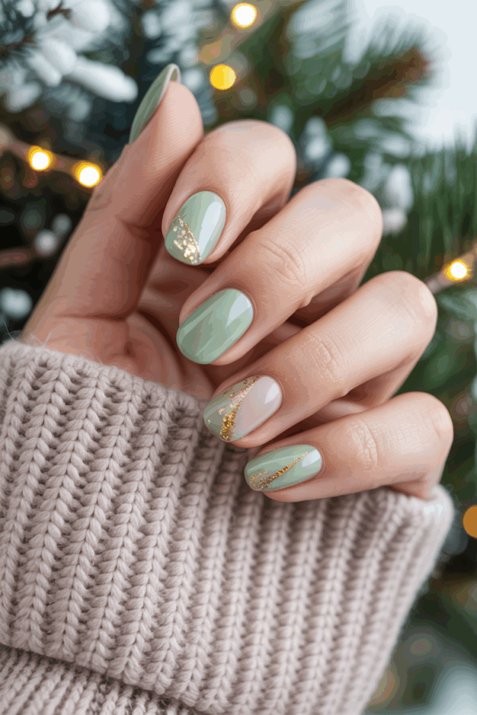 Pairing muted sage with restrained gold glitter is a masterclass in balance: calm color meets celebratory sparkle. Concentrate ultra-fine glitter near the tips for a gradient, or frame the cuticle with a delicate gold crescent for a reverse-French effect. The gold warms up sage’s cool undertone, making the manicure friendly to both silver and gold accessories. It is a versatile pick for everything from office parties to elegant dinners, giving you just enough shine to feel festive.