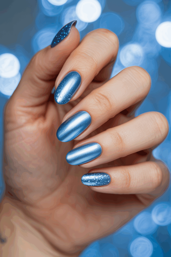 Cool blue tones evoke images of frozen lakes and snow-covered mornings, making them a perfect winter choice. A medium frosty blue base paired with subtle silver glitter creates dimension and sparkle without looking overdone. The glitter can be dusted lightly along the tips or applied in soft gradients for a more ethereal effect. This color combination captures the tranquility of winter skies and looks equally beautiful with jeans, knitwear, or formal evening wear. It’s a balanced design that feels seasonal yet classy, ideal for anyone who loves icy shades with a touch of shine.