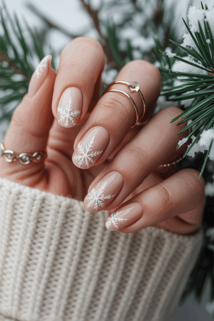 Soft nude nails paired with crisp white snowflakes are the definition of understated winter elegance. The neutral base complements every skin tone and gives a natural, clean backdrop for detailed snowflake art. You can paint one or two accent nails with snowflakes or scatter them across the entire set for a snowy effect. The look works well for professional settings and holiday parties alike, bringing sophistication without too much flash. Adding a glossy topcoat gives the nails a glass-like shine that enhances the simple beauty of this timeless design.