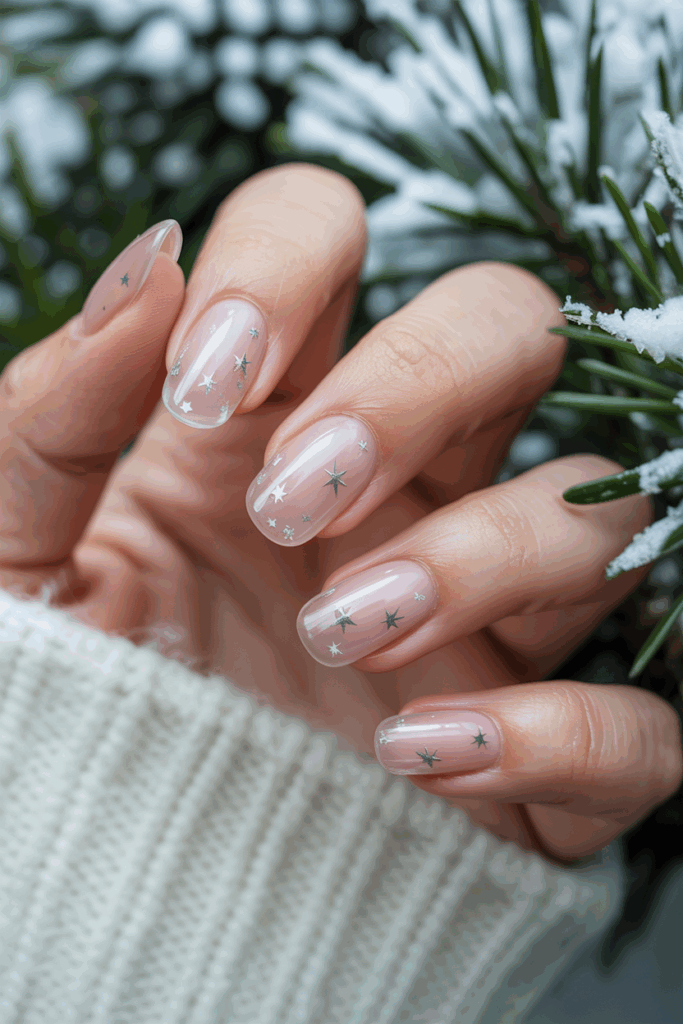 Clear nails offer a sleek, transparent base that lets small details shine—literally. Embedding tiny silver stars beneath a glossy topcoat creates the illusion of twinkling lights frozen in ice. This look feels fresh and futuristic while still capturing winter’s celestial beauty. The transparency keeps it lightweight and versatile, while the stars add a festive yet refined sparkle. It’s perfect for anyone who wants their nails to look creative and seasonal without committing to strong colors or heavy designs, embodying the quiet magic of starlit winter nights.