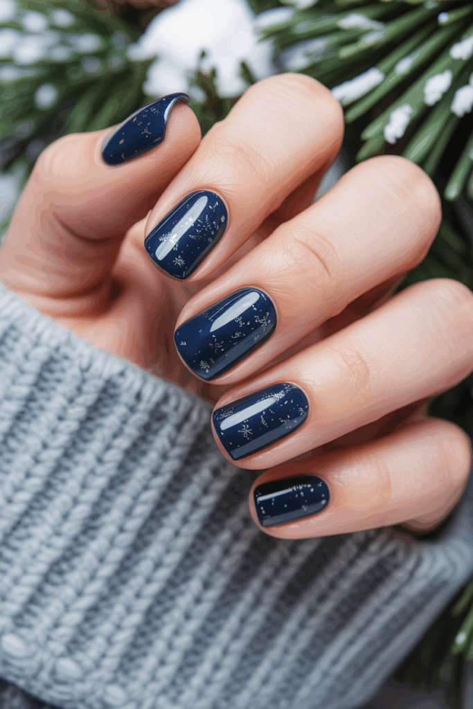 Dark navy nails bring drama and depth, evoking the feeling of clear winter nights. Sprinkling tiny silver flecks across the surface creates a subtle starlit shimmer that’s both modern and enchanting. The contrast between deep blue and metallic sparkle feels luxurious yet calm. This design suits shorter nails especially well and pairs beautifully with silver rings and cool-toned fashion. It’s a sophisticated alternative to black nails and works for both everyday wear and evening elegance.