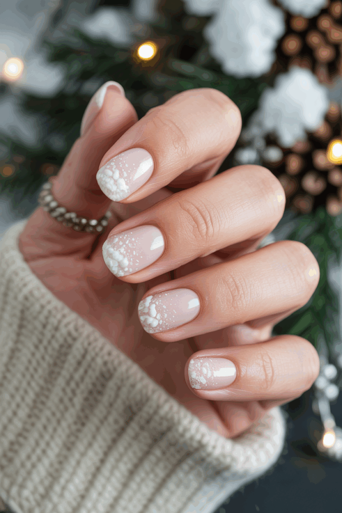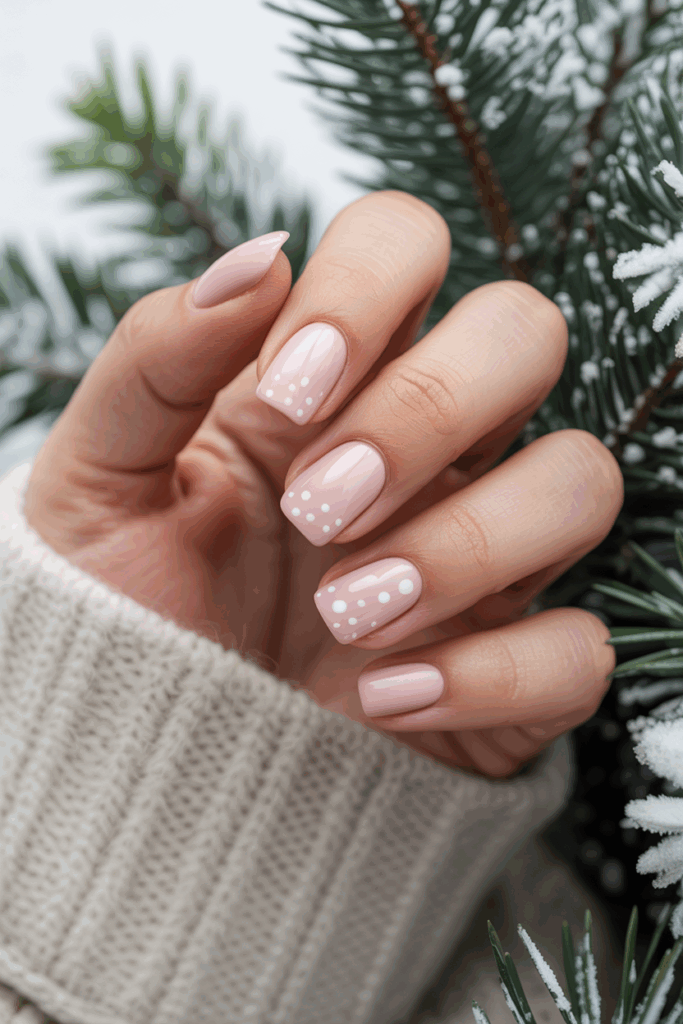 A pale pink base brings warmth and softness to the coldest months of the year. Add tiny white dots evenly spaced across each nail to create a clean, Scandinavian-inspired look. The combination feels cozy, feminine, and balanced, reminiscent of softly falling snow. It’s versatile enough to wear daily yet festive enough for the holidays. Because the design is minimal, it pairs beautifully with layered jewelry or textured winter outfits, making it a favorite for those who prefer subtle artistry over bold designs.