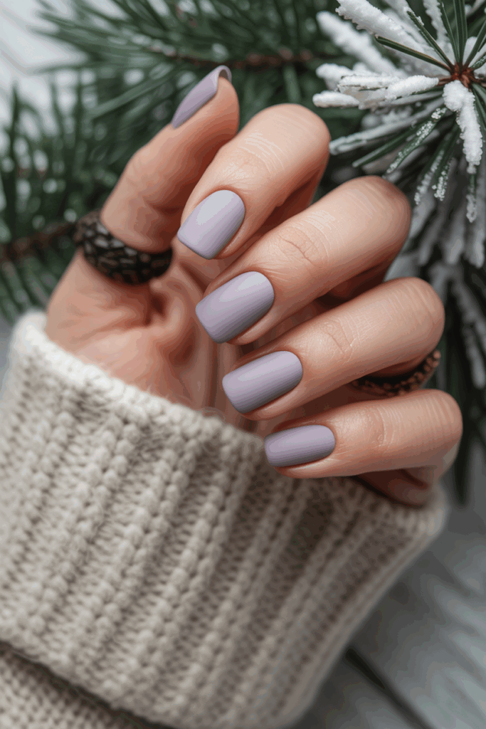 Muted lavender nails bring a hint of color while maintaining the quiet calm of winter tones. The matte finish adds depth, making the shade appear rich and velvety. It’s a subtle nod to early spring while still fitting perfectly into a winter palette. This color looks beautiful on every skin tone and pairs wonderfully with soft gray and cream clothing. It’s a refreshing alternative to neutrals for those who want something soothing yet unique, offering a peaceful, graceful vibe that feels right at home in colder months.
