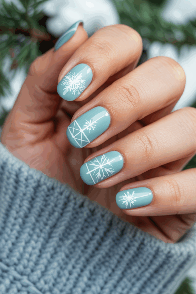 Soft aqua nails evoke the cool stillness of frozen lakes, while geometric white or silver accents bring a clean, modern twist. Simple shapes like triangles, thin lines, or chevrons give the manicure an architectural elegance that still feels festive. The icy hue works beautifully under bright light, reflecting just enough color to stand out subtly. This design blends artistic flair with simplicity, making it an excellent choice for anyone who loves structure, balance, and soft pops of wintry color.