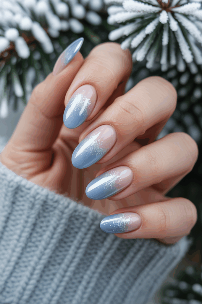 Almond-shaped nails elongate the fingers naturally, and when paired with a soft ombré of white fading into pale blue, they capture the dreamy essence of frost. This gradient design feels delicate and serene, reflecting the subtle beauty of frozen mornings. The look’s simplicity makes it easy to recreate at home, while the color transition adds an elegant depth. It’s perfect for anyone wanting a winter nail design that feels polished, graceful, and endlessly wearable from December through February.