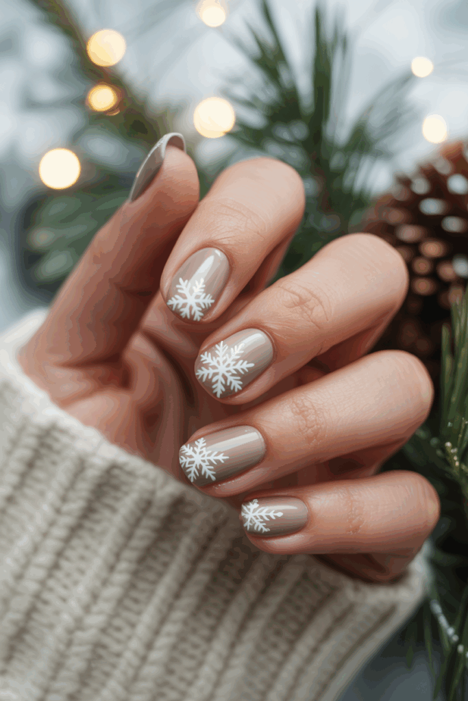 Warm taupe nails exude cozy comfort while still appearing sleek and stylish. Adding a few small white snowflakes across the nails enhances the seasonal charm without overpowering the neutral tone. The contrast between the warm base and the crisp white details creates balance, making the design both versatile and festive. It’s ideal for winter brunches, coffee dates, or even Christmas gatherings, offering a modern yet gentle take on holiday nail art that remains wearable long after the decorations are packed away.